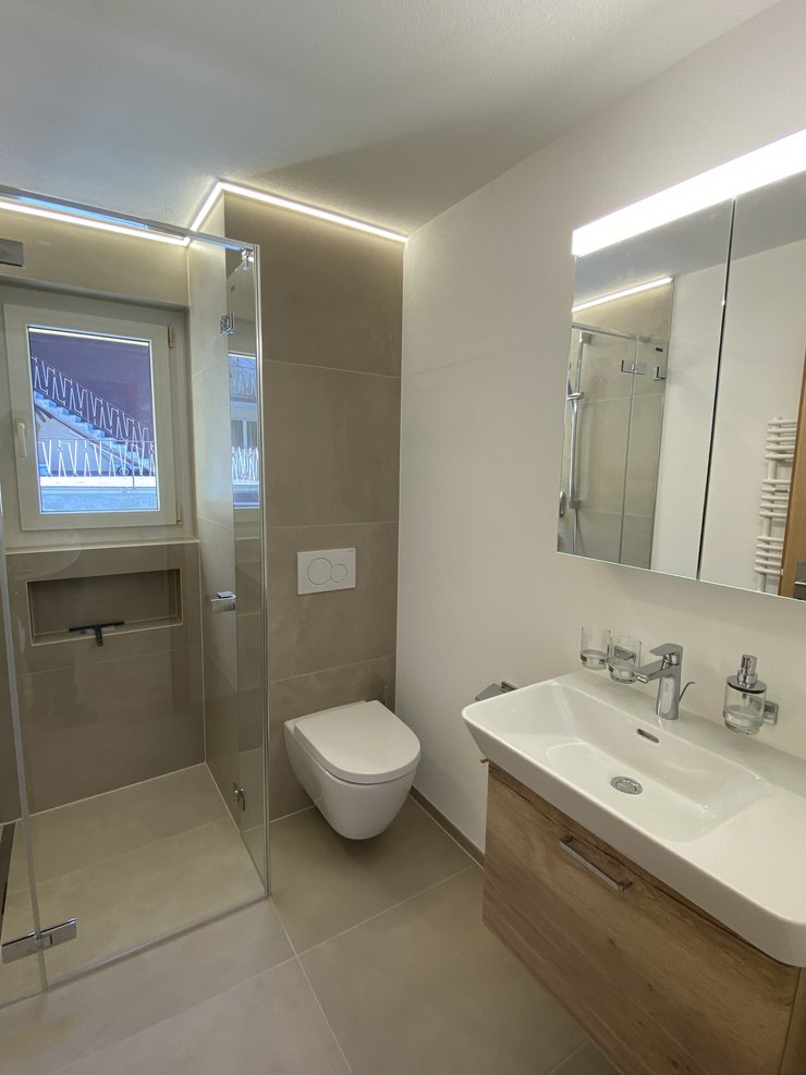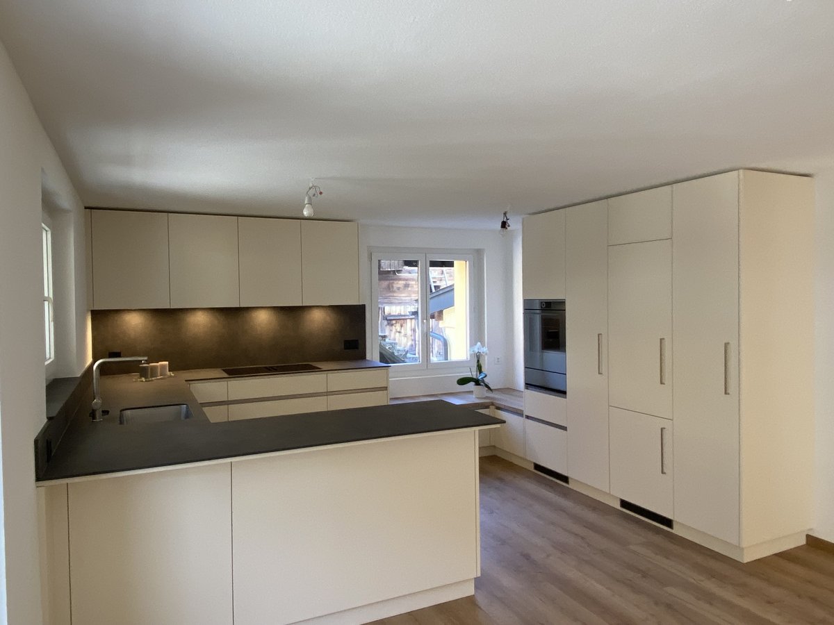 helle neue Küche mit Esszimmer, 3 geräumige Zimmer und ein grosses Wohnzimmer mit Glasfaseranschluss, Tages/WC, Dusche/WC, Keller, Waschmaschine/Tumbler im Waschraum, Aussenparkplatz und geräumige Garage
