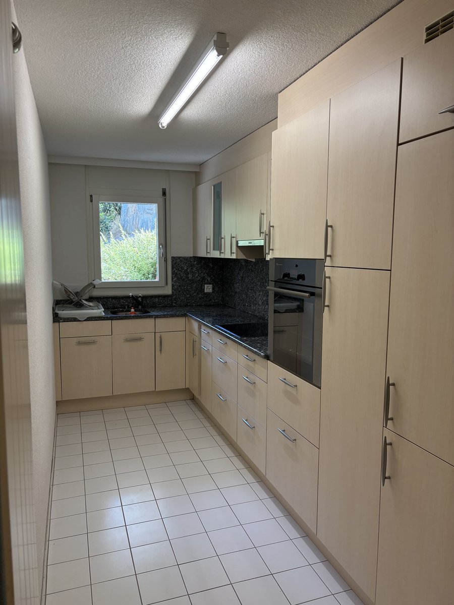 Helle, neuwertige Wohnung mit unverbauter Sicht Ost/Südost. 4 Gehminuten vom Parkhaus entfernt. Separater Eingang mit Windfang und Garderobe. Separate Küche. Grosszügige Terrasse mit gedecktem Sitzplatz und Blumenbeeten.