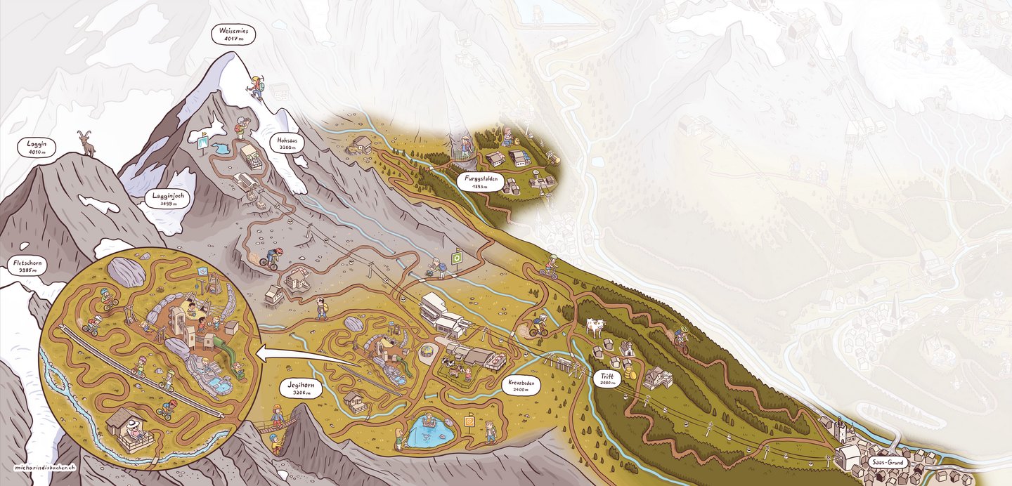 High up on Hohsaas, the hearts of adrenaline junkies beat faster. The Hohsaas Trail for mountain biking, the ascent to the Weissmies and the Glacier Experience Tour starts from here. Those who would like to learn more about the 18 four-thousand-metre peaks of the Saas Valley can take the corresponding theme trail. The path of impressions takes you to the Weissmies hut and then to Kreuzboden.