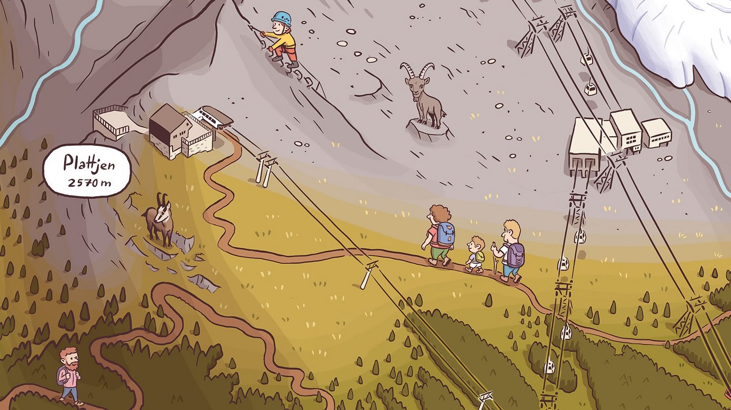 Plattjen (2,570 m above sea level) is an excursion destination above Saas-Fee. Here it is stony, rough and exceptionally wild. But it is not only because of the landscape that we call Plattjen a wild mountain. Early in the morning, you have the best chance of spotting impressive wild animals such as ibex and chamois. Hiking and via ferrata enthusiasts, in particular, get their full enjoyment up here.