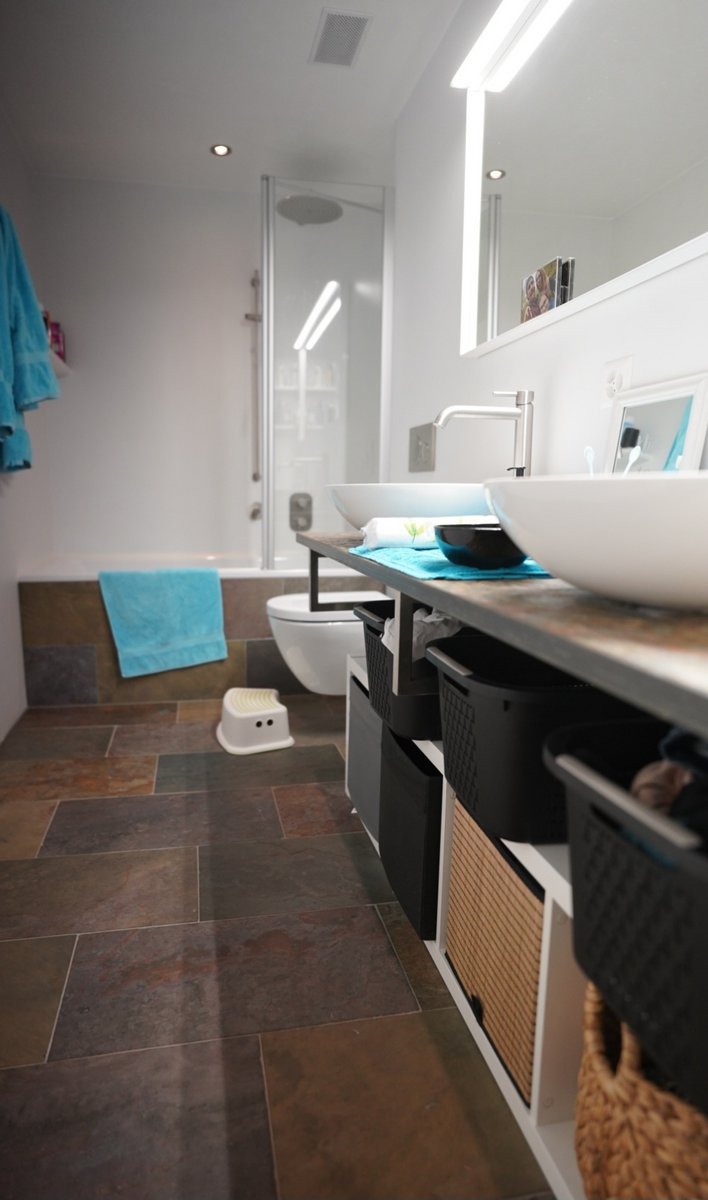 Ein neu erstelltes Einfamilienhaus mit geräumigem Wohn- und Essraum mit Küche, Cheminée, Lagerraum und Tages-WC in Dachgeschoss, 2 Schlafzimmer mit jeweils eigenem Bad/WC im 1. OG und zwei Schlafzimmern mit einem gemeinsamen Bad/WC, 3 Badezimmer mit WC und ein Tages-WC,